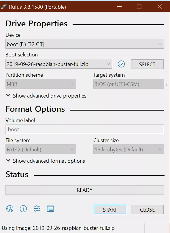 Langkah pertama yang harus kamu lakukan adalah mengunduh file – file yang dibutuhkan. Untuk membuat bootable media kamu bisa menggunakan rufus yang bisa kamu unduh di sini. Kami merekomendasikan untuk menggunakan yang versi portable saja. Selanjutnya download file OS raspbian buster / raspberrypi OS di situs resmi raspberry di sini. Ada 3 varian yang bisa kamu pilih yaitu versi lite, versi destop, dan versi dekstop ditambah sofware tambahan. Untuk kamu yang menginginkan raspbian sebagai komputer desktop, kami merekomendasikan untuk mengunduh yang versi lengkap.