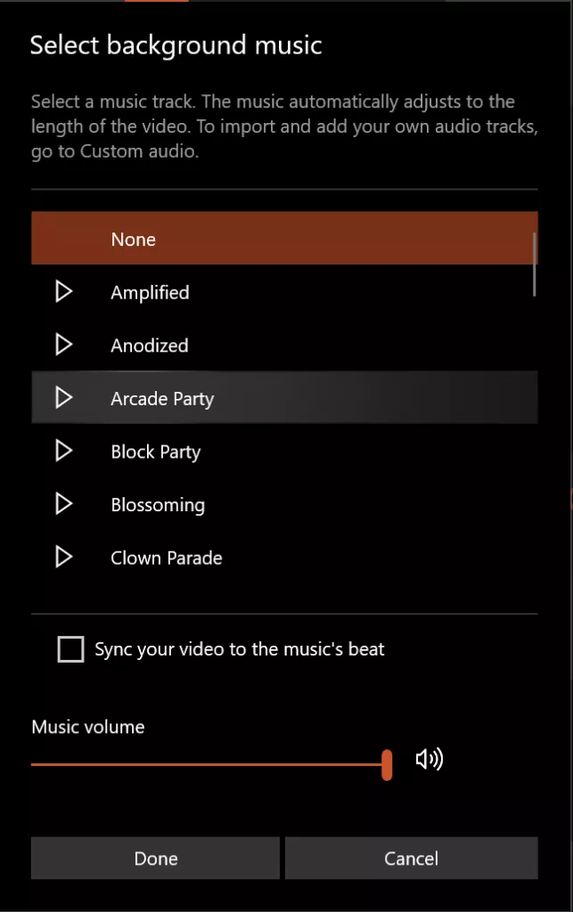 Kamu juga bisa menambahkan musik kedalam video kamu. Caranya tinggal klik tombol background music pada atas layar. Lalu kamu akan disuguhkan beberapa music yang bisa langsung kamu masukkan ke dalam video.